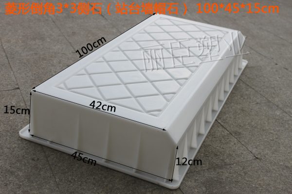 市場上一款極為少見的混凝土路側石模具,主要用來預制澆筑高鐵、鐵路站臺墻混凝土路側石之用。其中長度一邊為倒角設計,倒角低處尺寸為12厘米,高出尺寸為15厘米,根據實際倒角坡度精確規劃。