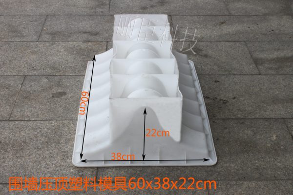 這款仿古圍墻壓頂模具在制作上采用PP聚丙烯塑料為原料,模具規格為60x38x22cm,壓頂外觀上呈屋頂磚瓦的外形,這樣的設計能讓雨水減少在圍墻墻面上,且能在壓頂下方預埋線纜,減少因線纜的暴露導致的安全隱患。在仿古圍墻壓頂模具澆筑的水泥制品上,可以選擇多種顏色,較為常見的便是以紅色、金色和白色為主,水泥制品壓頂的顏色可以在模具澆筑完成后涂抹上去,也可以在模具澆筑前首先進涂抹在壓頂模具內部。