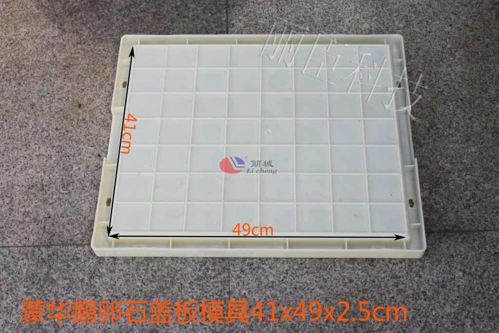 麗臣制作的蒙華鵝卵石蓋板塑料模具在規格上,除了41x49x2.5cm外還有49×48.5×2.5、54.5x41x2.5多種規格完全滿足客戶在對塑料模具上的需求,且這款蒙華鵝卵石蓋板混凝土在澆筑過程中是以RPC蓋板為設計外形,從而以達到薄承受更重為目標。