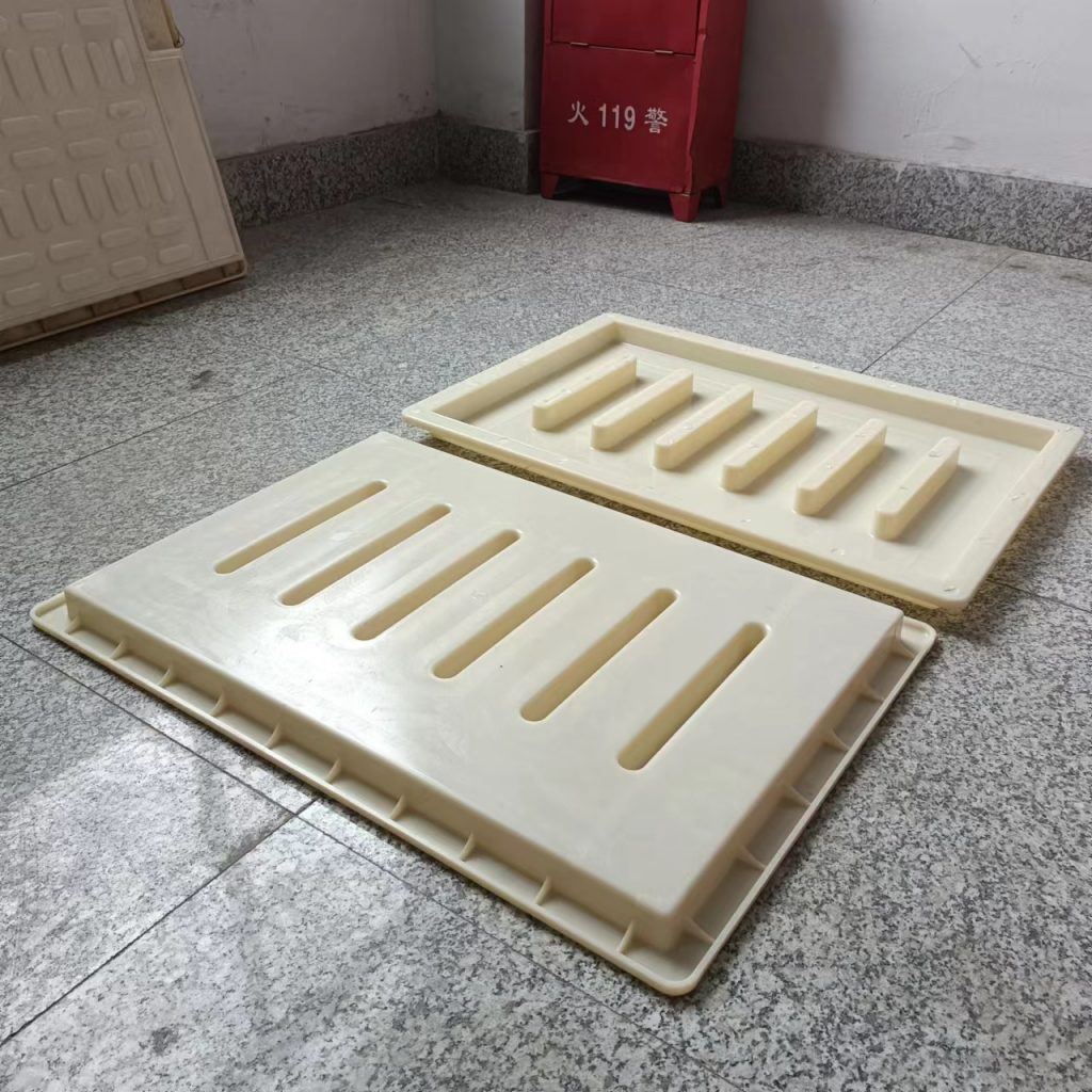 這款塑料雨水蓖模具厚度只有3cm,長寬尺寸為60cm*40cm,他主要用于下水、流水蓋板活性混凝土預制(RPC)預制,他的厚度較薄,與一般材質的雨水蓋模具不同,他采用的材質是ABS材質,這種材質質地比PP材質硬,強度大,使用次數多,這種模具主要預制成型雨水蓋板,普通用于市政道路路面排水使用。他一共有六個排水孔,排水效果很好。水流效果比較好