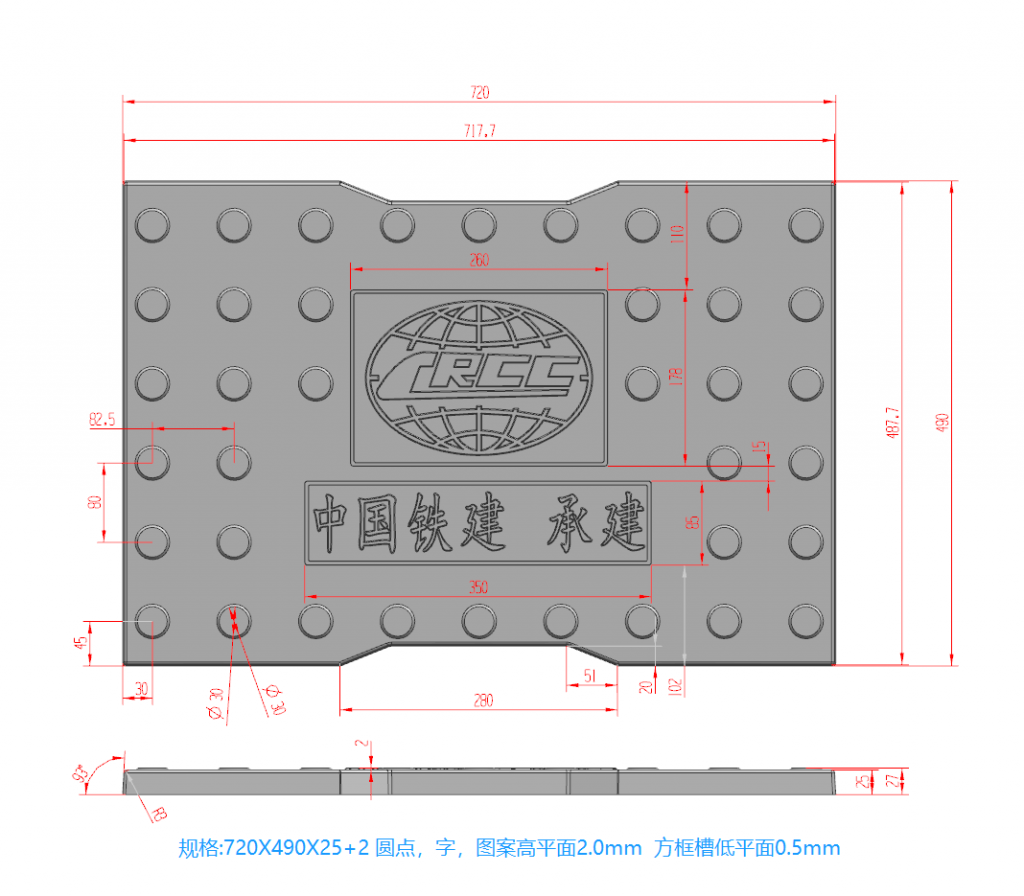 模具較薄,主要用于rpc材質(zhì)預(yù)制制作,花紋為缺口圓點(diǎn),中間帶有中鐵圖標(biāo),底部設(shè)有中國(guó)鐵建 承建字樣,為中鐵專用模具。