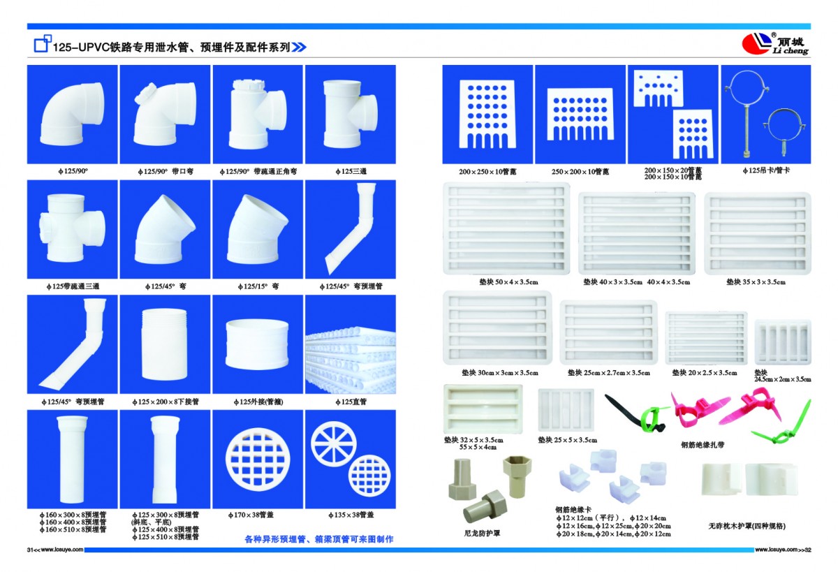 30頁:各地生產施工現場 ? ? ? ? ? ? ? ? ? ? ? ? ? ? ? ? ? ? ? ? ? ? ? ? ? ? ?31-32頁:125-UPVC鐵路專用泄水管、預埋件及配件系列